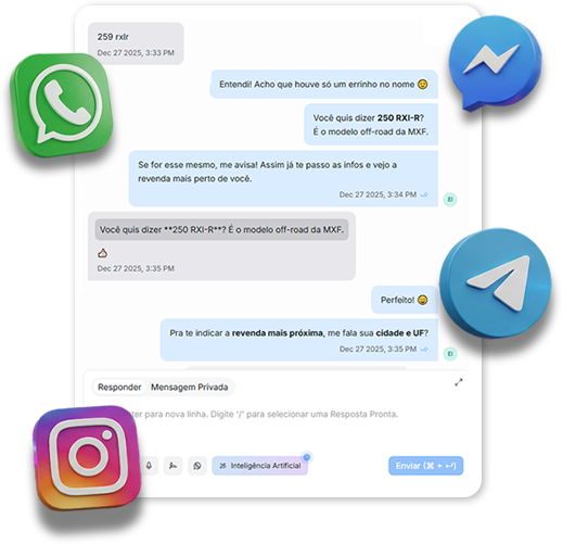WhatsApp, Facebook Messenger, Instagram Direct e Telegram, tudo em uma plataforma para otimizar o atendimento, é mais eficiência comercial com o poder da Inteligência Artificial.