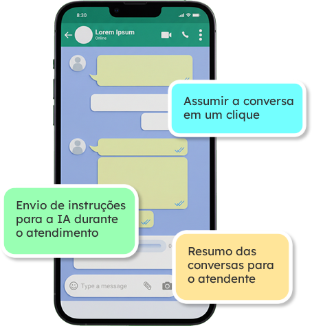Você poderá assumir o atendimento, enviar instruções para a Inteligência artificial ou configurar o assunto que será encaminhado ao atendente humano. Conte ainda com um resumo da conversa ao final.